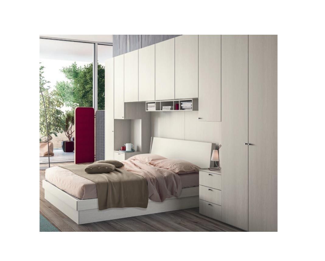 ARMADIO A PONTE CON LETTO CON CASSONE PORTE A BATTENTE VANI A GIORNO LATERALI. IN OLMO BIANCO. MISURA L.4,05 P. 60,0 H. 2,53/2,34. COMPOSIZIONI A MISURA.