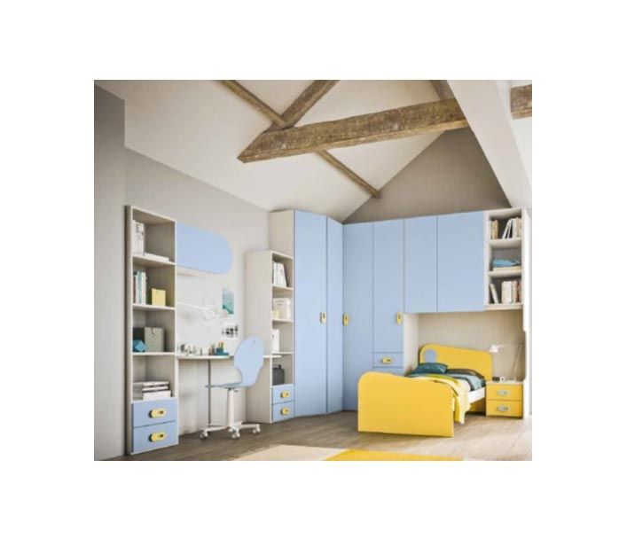 CAMERETTA ANGOLARE A PONTE CON LETTINO ARMADIO E PONTE ANGOLARE E CABINA H 251.2 CON SCRIVANIA SEDIA FINITURA DELLA CAMERETTA OLMO/LUCE/ AZZURRO/ GIALLO (DISPONIBILE IN ALTRI COLORI)