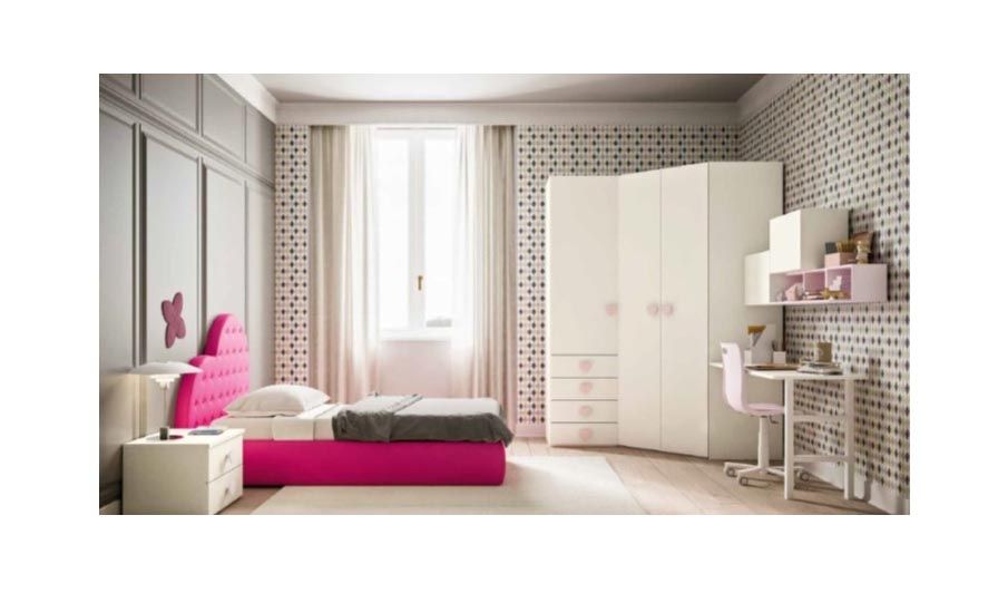 CAMERETTA CON ARMADIO ANGOLARE SCRIVANIA E LETTO ARMADIO ANGOLARE 3 ANTE PIU' CASSETTI MISURA H 2.32 FINITURA DELLA CAMERATTA FRASSINO NEVE ROSA PASTELLO POSSIBILI ANTRI COLORI