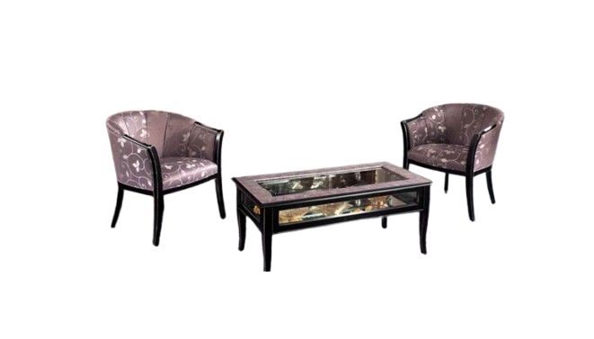 POLTRONE IMBOTTITA E TAVOLINO RETTANGOLARE MISURE: L.65. H. 79. P.63. TAVOLINO RETTANGOLARE CON PIANO IN VETRO DECORATO E CONTORNO IN ECOPELLE. FINITURA LACCATURA PATINATA AVORIO BIANCO.MISURE: L.1,00. H. 48. P.50