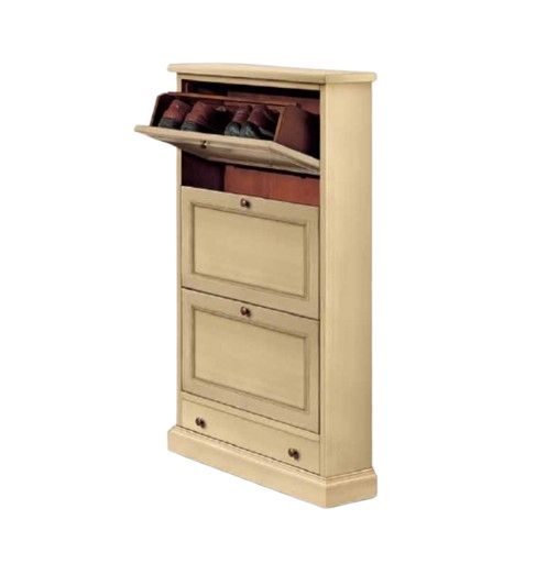 SCARPIERA 3 ANTE E UN CASSETTO MISURE; L. 77 P. 22 H. 1.28; PATINATA LACCATA CON COLOR AVORIO.