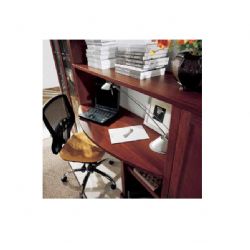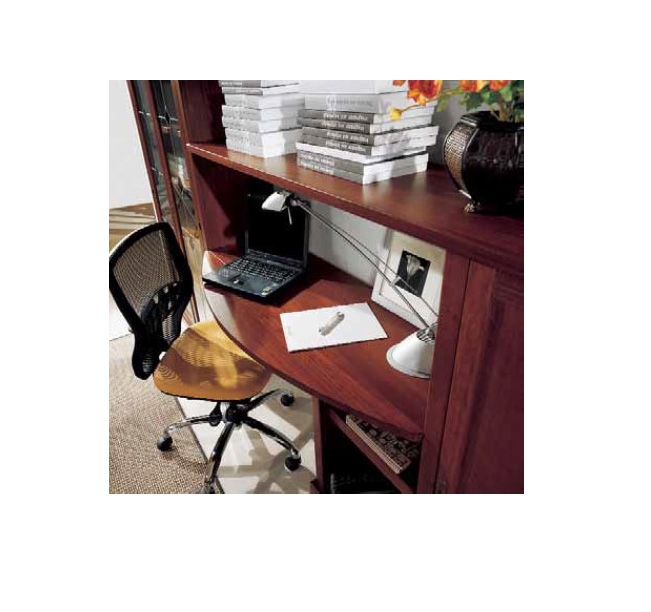 SOGGIORNO COMPONIBILE PER STUDIO MISURA L.2.91.H.2.03. P.40/55. PARTICOLARE CON MENSOLE E RIPIANO CURVATO. PATINATO E VERNICIATO COLOR NOCE A CERA.