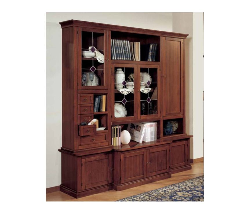 SOGGIORNO COMPONIBILE MISURA L.2.00 H.2.27 P.50/63. CON VETRI LEGATI PIOMBO E CASSETTINI LATERALI. PATINATO E VERNICIATO COLOR NOCE A CERA.