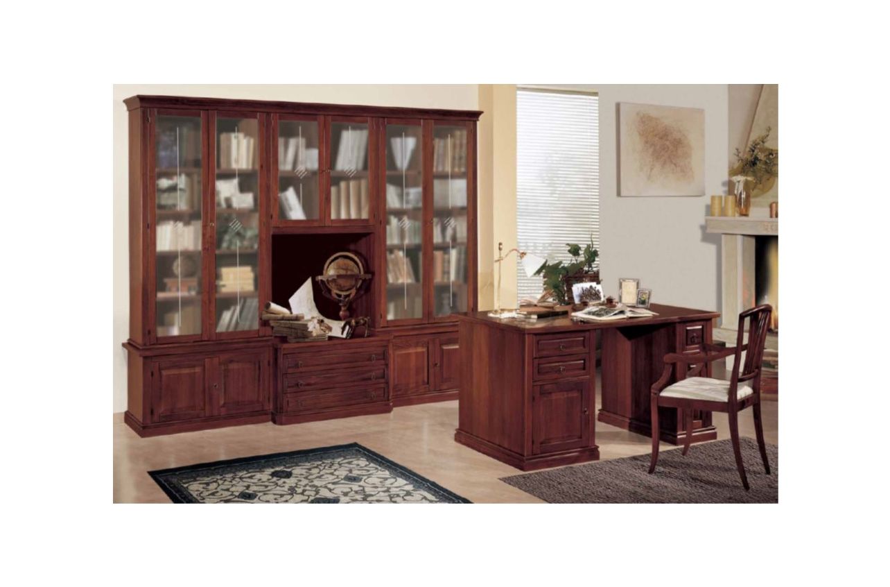 SOGGIORNO STUDIO COMPONIBILE MISURA L.2,86 H.2.27. P.50/63. SCRIVANIA. MISURA L.1.60 H.83.5 P.82 CON CASSETTI. TRE CASSETTI PARTE CENTRALE VETRINE CON VETRI INCISI. PATINATO E VERNICIATO COLOR NOCE A CERA.