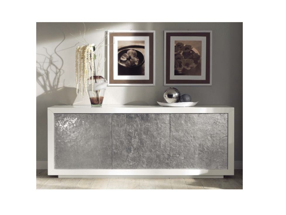 MADIA VERTICALE CONTEMPORANEA MISURA L. 1,90 H. 75. P. 52. STRUTTURA LACCATA OPACA RAL 9010 ANTE SPATOLATE IN FOGLIA DI ARGENTO